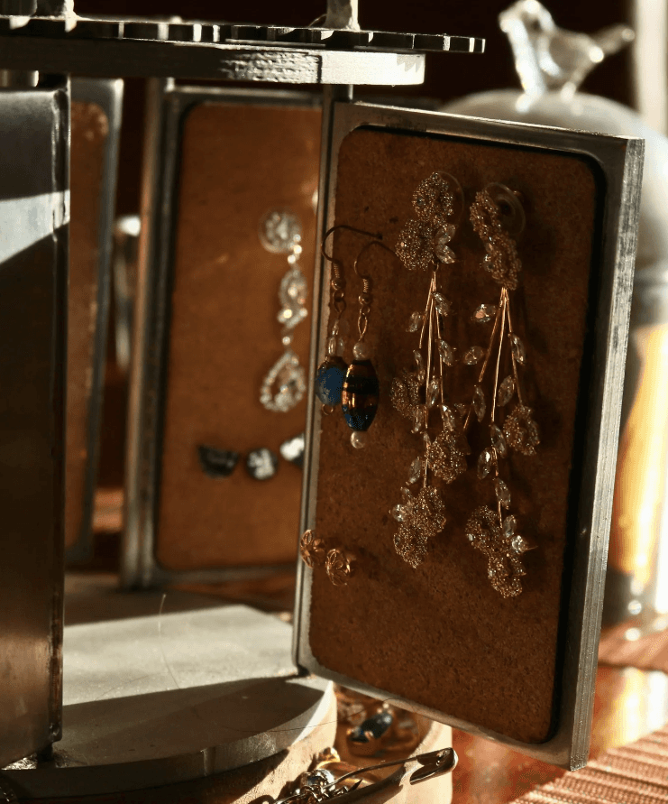 A 5-paneled Reuge-inspired rotating caddy designed to hold and conveniently access jewelry.